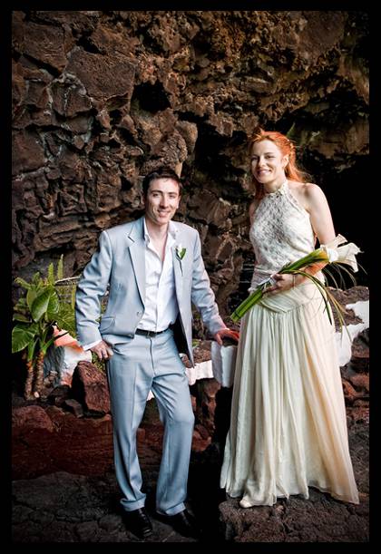 The wedding ceremony was held at Jameos del Agua, a volcanic cave system that Lanzarote-born artist César Manrique helped to create. It consists of an auditorium, swimming pool, gardens and restaurants, all blending into the surrounding volcanic landscape. The ceremony was held in an area overlooking the Atlantic ocean, with cocktails, champagne and canapés served in the cooler lush pool area inside the cave system.