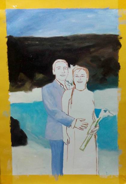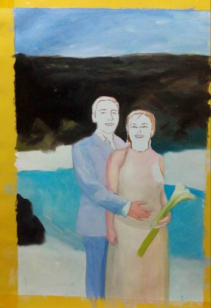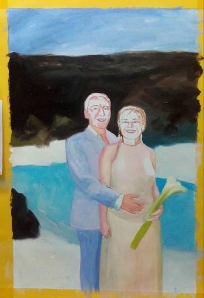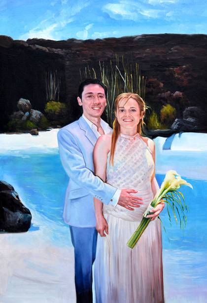 Sara & Tony felt that the background of the oasis summed up their ceremony perfectly, but their favourite photo of themselves was a different one. After much deliberation they decided to combine the two photos to create their unique portrait. We took the best elements of both photographs, extended the blue sky and after a few emails back and forth the couple signed off on their final version of the photograph to be used by one of our artists to hand paint their portrait.